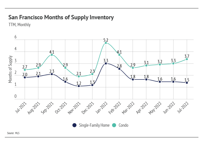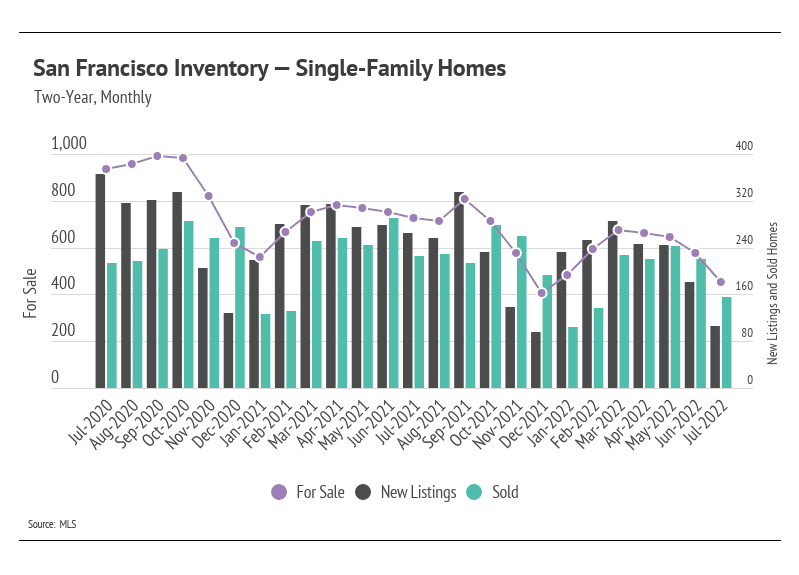 San Francisco’s housing inventory has been in decline since March, which indicates that 2022 will likely have the lowest inventory on record. We entered 2022 with the lowest inventory in history, but the number of homes for sale rose over 50% from December 2021 to March 2022, only to trend back toward all-time lows. Over the past 20 months, inventory has trended lower and settled at a depressed level. The number of single-family homes on the market in July 2022 is 50% lower than in July 2020, with 33% fewer condos. San Francisco is particularly sensitive to rate hikes due to the high absolute dollar cost of housing.